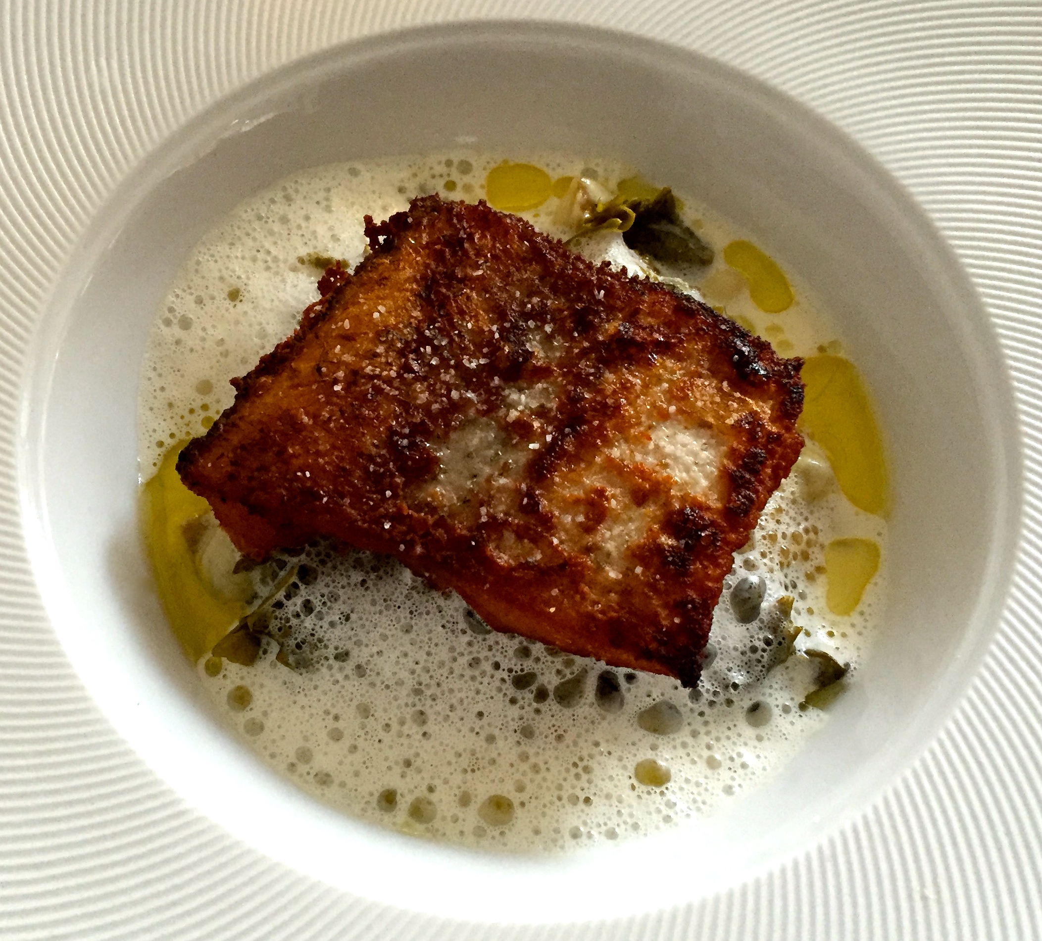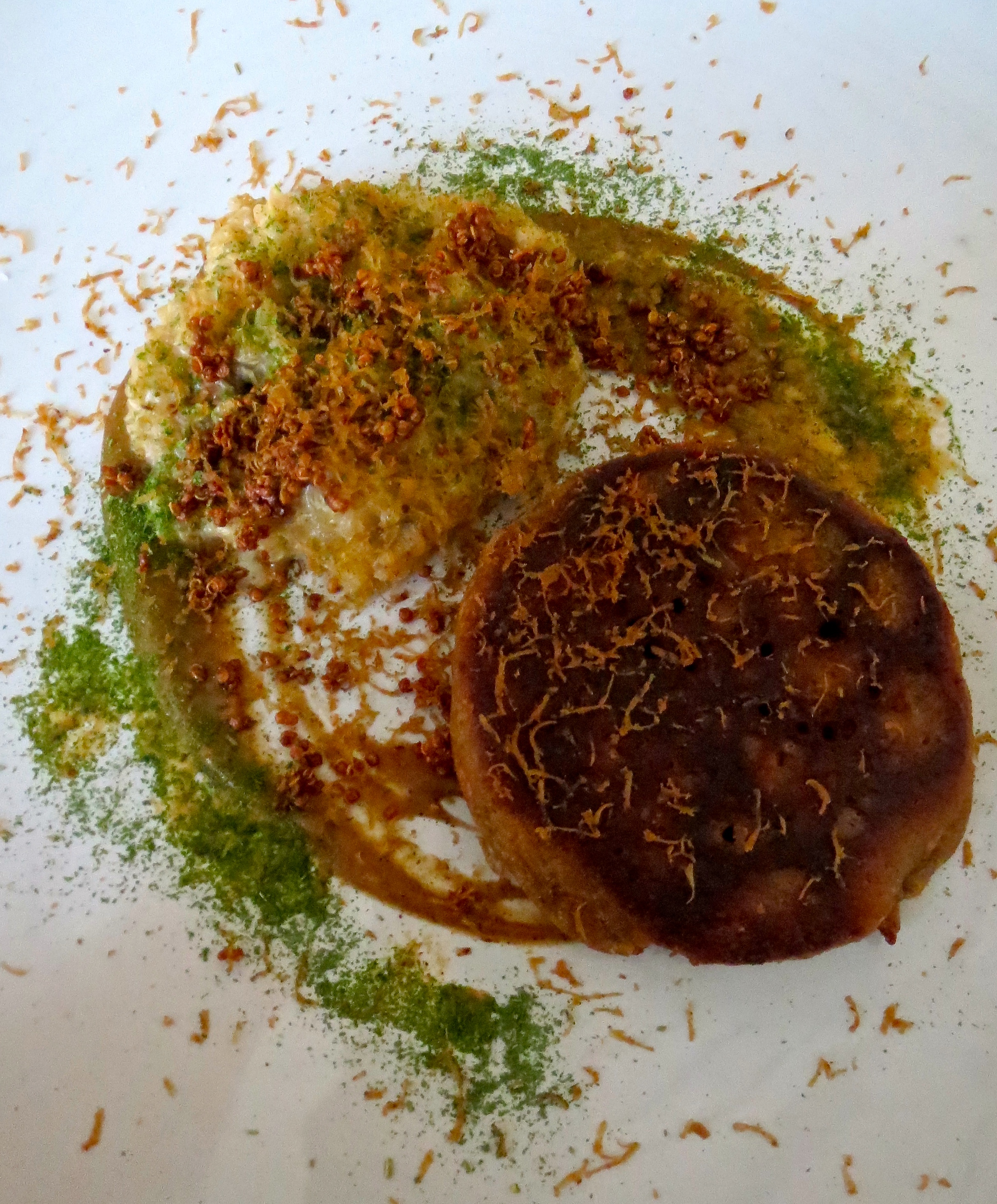 Pääruokia edeltää jälleen tervehdys keittiön puolelta, rapsakka ja raikas kulaus omenamehua. Tässä välissä muutama sananen juomista: suositusviinit ovat C:n tapojen mukaan vain eurooppalaisia, erikoisia ja vaativat ehdottomasti ruokaa rinnalleen. Alusta loppuun Aleksi pitää niitä viineinä, joiden ensipuraisu ei vakuuta, mutta jotka yhdistettyinä tarjoiltuihin annoksiin kokevat suuremman tai pienemmän muodonmuutoksen. Tämä on sitä ammattitaitoa. Oma alkoholiton juomapuoleni sen sijaan koostuu hieman yllättäen pelkistä mehuista. Valtaosa niistä on kuitenkin todella hyviä ja ruoka-annoksiin sopivia, enkä millään muotoa kadu niiden lisäämistä ateriakokonaisuuteeni. Kaikkien raaka-aineita en valitettavasti enää muista, mutta erityisesti fenkolista, marja-aroniasta ja tyrnistä johdetut mehut jäivät mieleen. Eipä taida tällaista mehumenua muualla päästäkään kokemaan, siis suosittelen lämpimästi.