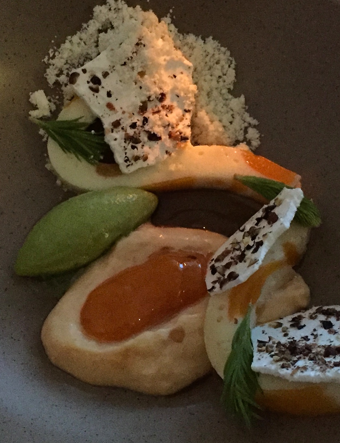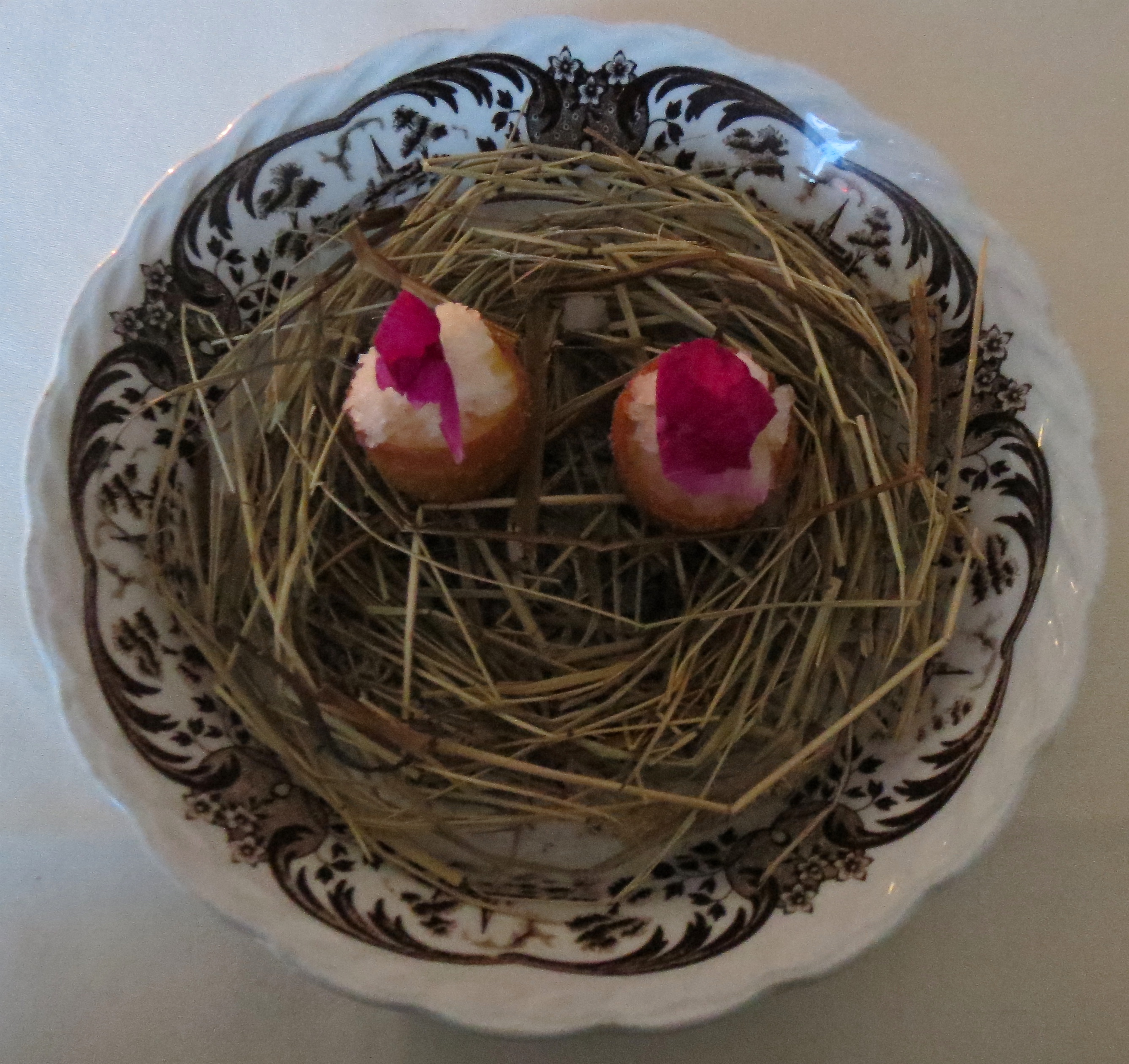 Ennen viimeistä näytöstä meille tarjoillaan vielä tervehtivä suupalanen keittiön suunnalta. Tällä kertaa keksikupin sisältä löytyy ruusunterälehdellä koristeltu granita, jonka osittain moussemainen koostumus tekee tästä parhaan koskaan maistamani granitan. Herkullisen amuse bouchen illan finaali onkin ansainnut, sillä itse jälkiruoka, hillaa, kuusenkerkkää ja härkäpapua, on esitys joka hurmaa sekä ulkonäöllään että monipuolisilla mauillaan. Kielelle jää pyörimään kattaus ihastuttavia makuja.