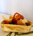 Ruokaretkemme käynnistyy kolmella kokin tervehdyksellä. Juureslastuista edukseen ovat tomaatti ja lanttu, pienet piirakat munavoilla kruunattuna ovat vallattoman maukkaita. Pekonista, punajuuresta ja rosmariinista koottu ”keko” ei sen sijaan vakuuta.