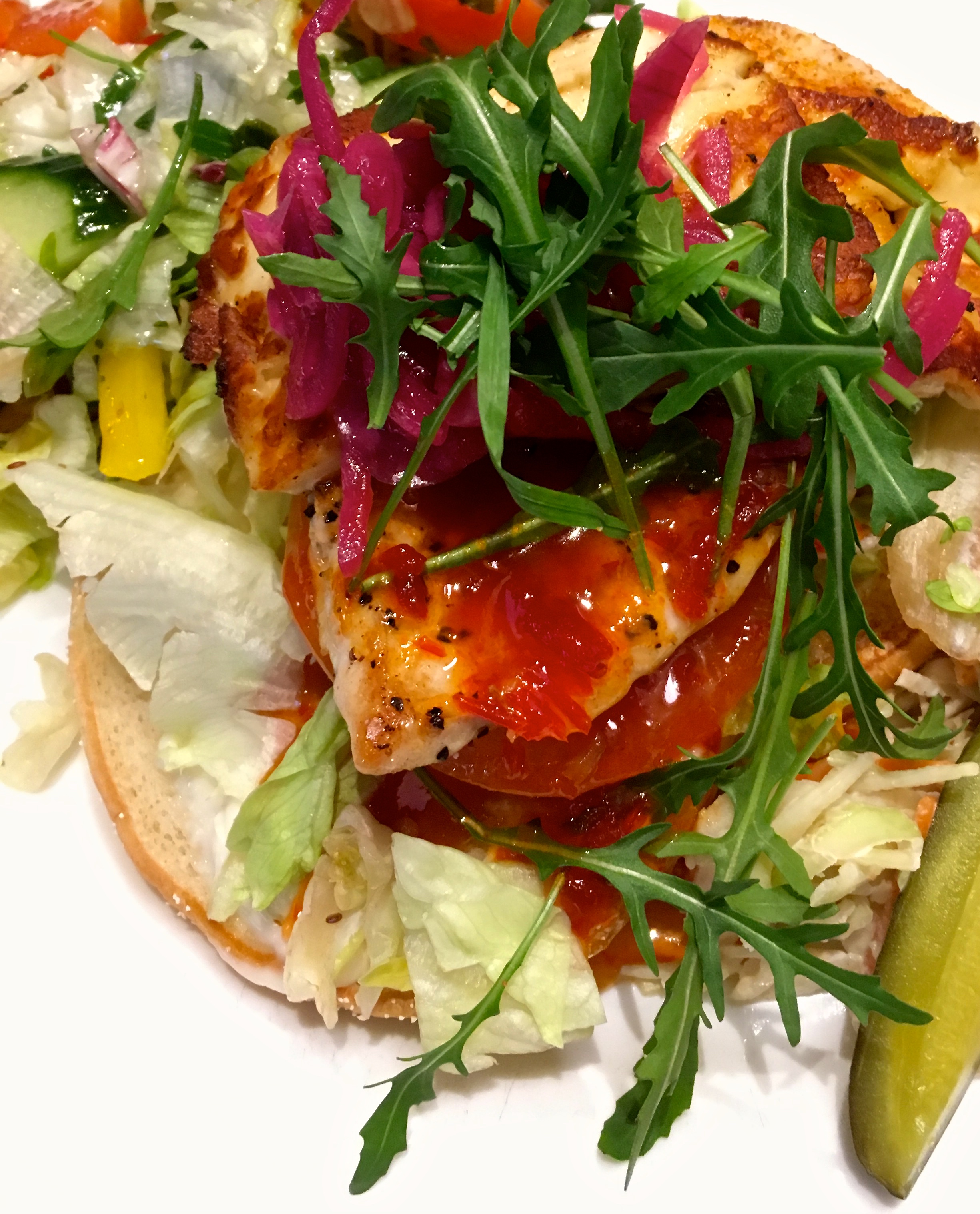 Me kokosimme hampurilaisemme itsetehtyjen sämpylöiden väliin ja lastasimme possun riekaleiden seuraksi grillikastiketta, salaattia, tomaattia, maustekurkkuja, punasipulihilloketta, jogurttikastiketta ja cheddarjuustoa. Yhdistelmä osoittautui varsin maukkaaksi, mutta koska puhutaan hampurilaisista, vain mielikuvitus on rajana. Ei siis muuta kuin kokeilemaan!