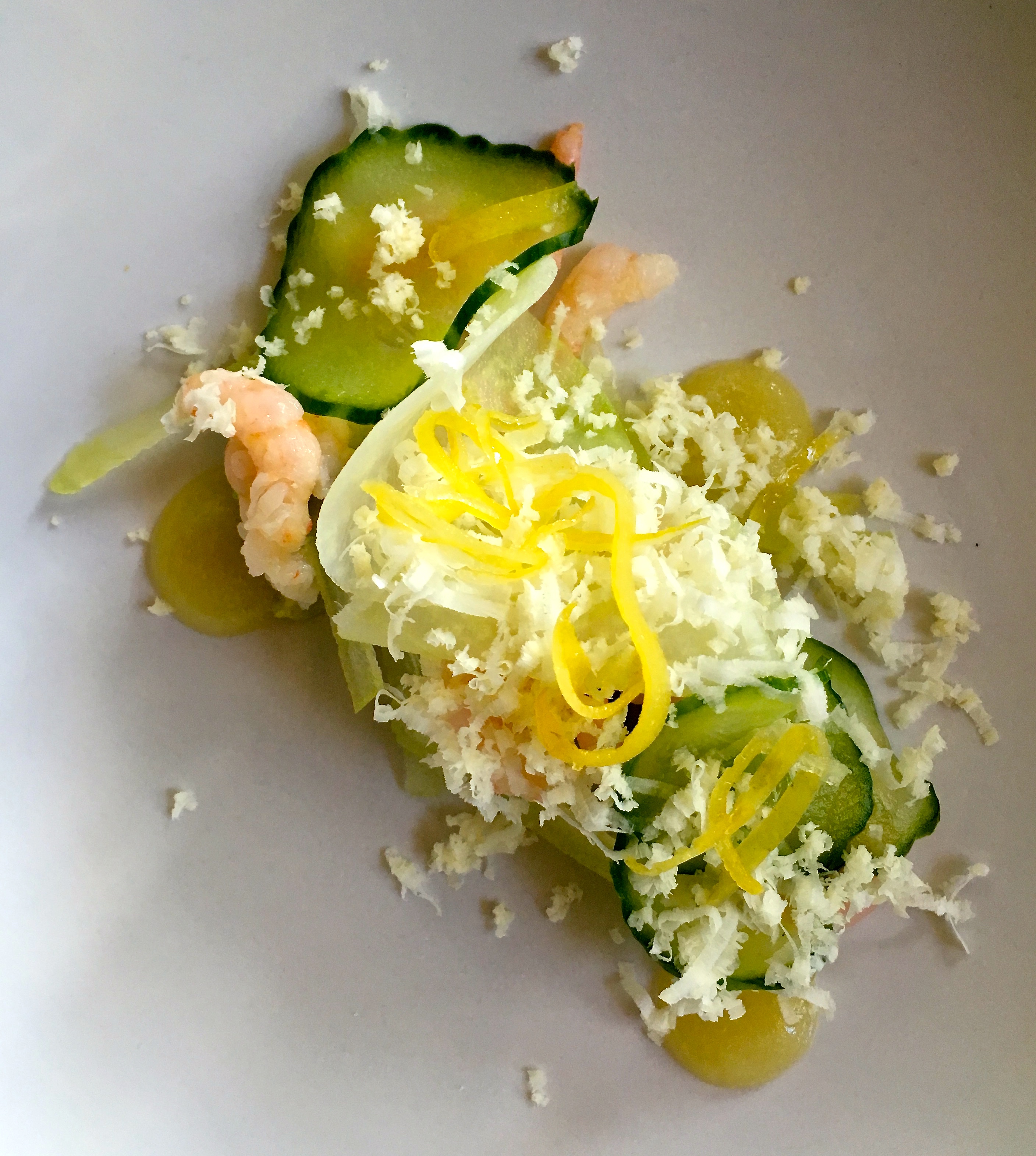 Ensimmäiseksi eteemme saapuu annos katkarapuja avocadon, inkiväärikurkun, kyssäkaalin ja piparjuuren kera. Ihan valloittavaa erilaisten mutta erittäin hyvin yhteensopivien makujen tanssia lautasella. Siis mainio aloitus. Toinen alkuruoka, se lihapuolen edustaja, on karitsaa tartarin muodossa. Voin myöntää, että kuullessani mitä tuleman pitää, en suoranaisesti hihku odotuksen ilosta, mutta voi sitä positiivisen yllätyksen määrää, joka minut valtaa ensimmäiset haarukalliset maisteltuani. Annos on todella hyvä aioleineen, sinapinsiemenineen ja ennen kaikkea