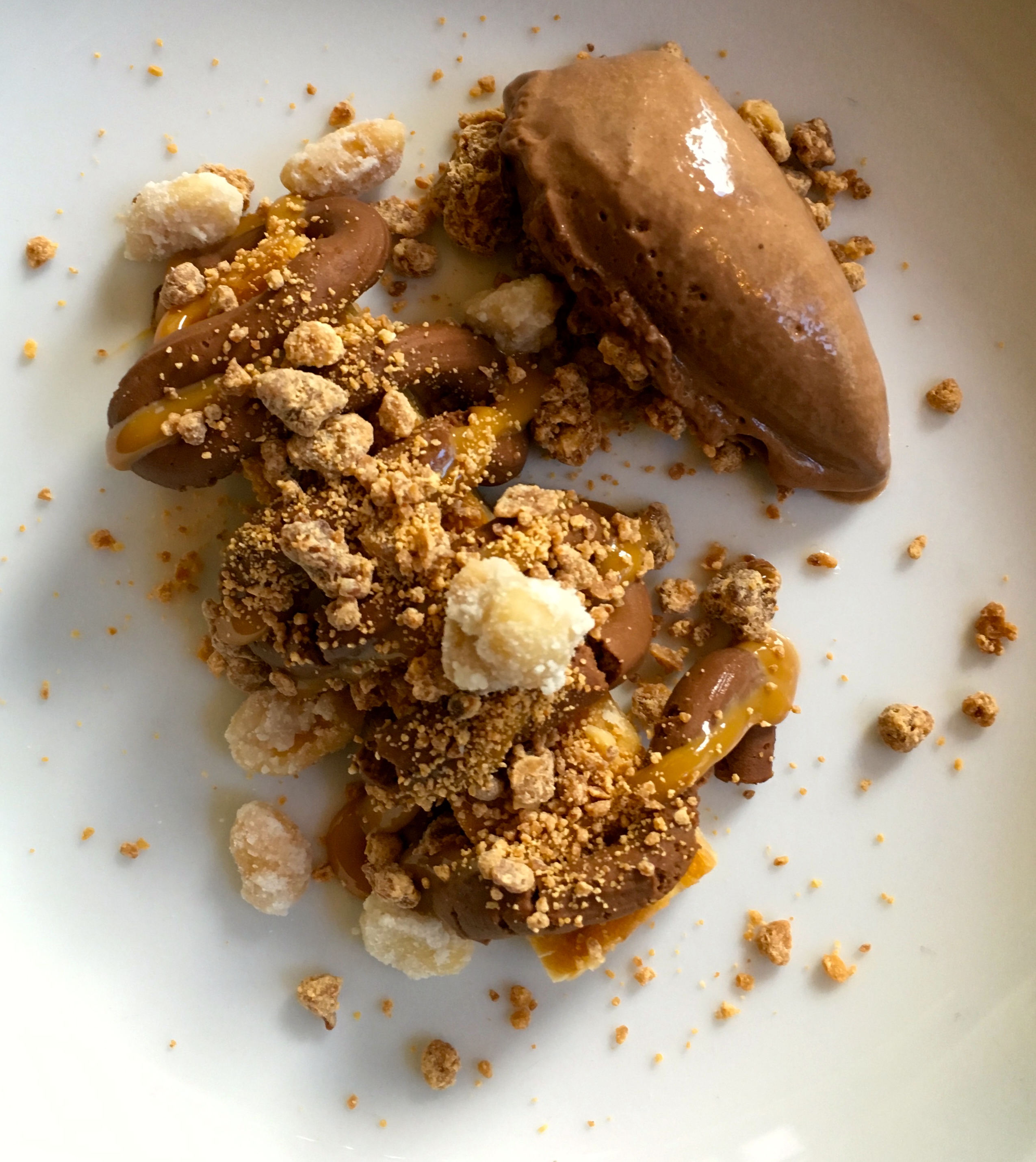 Kun ruokalajeja on jäljellä vielä kaksi, saammekin ehkä hieman yllättäen eteemme pähkinäkakkua suklaajäätelöllä ja suolakinuskilla aateloituna. Ihan selkeästi tuntuu jo lopetukselta, vaikka vielä jotakin pitäisi olla tulossa, olemmehan vasta neljännen ruokalajin kimpussa. Annos on jälleen kerran huippuluokkaa. Tässä kohtaa seurueemme pähkinäallergikko saa sydärin. Ei hänelle tarjoilluista pähkinöistä, vaan niiden sijaan hänelle tarjoillusta annoksesta mitäpä muutakaan kuin sydäriä, siis ankanmaksaa, Amerikan pannukakkua ja vaahterasiirappia. On kuulemma pala taivasta; sellainen sydäri, jonka ottaisi mielellään muutaman kerran päivässä, makean ja suolaisen täydellinen liitto. No, seurueemme maksasta pitämätön henkilö on annosta maistettuaan eri mieltä, joten uskaltanen suositella vain sillä varauksella, että sattuu pitämään maksasta, nimenomaan ankanmaksasta.