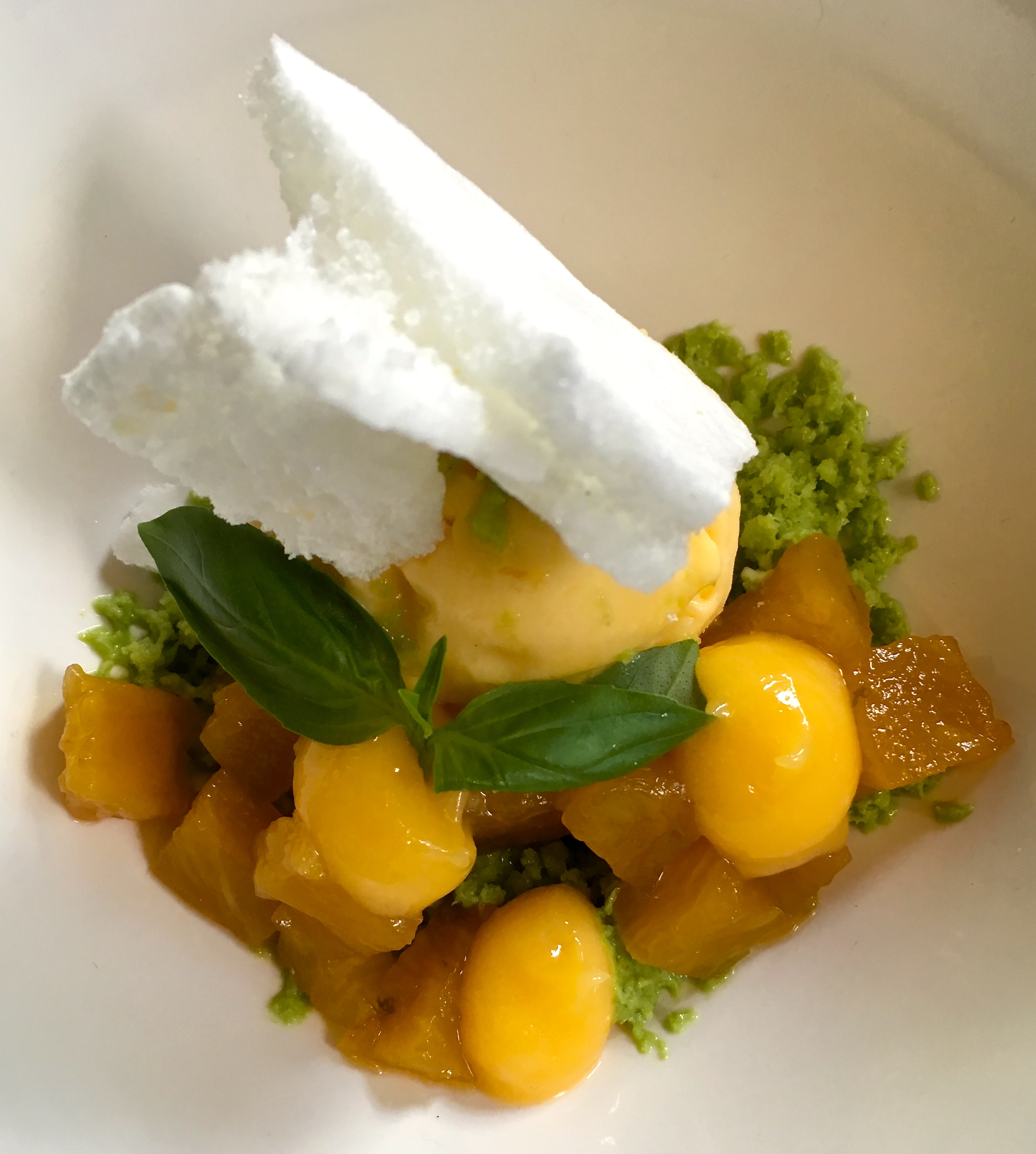 Erilainen mutta varsin paljon ainakin minun sokerista mieltäni miellyttävä valinta on tarjota kaksi jälkiruokaa tutumman kaksi pääruokaa -vaihtoehdon sijaan. Ateriamme viimeistellään annoksella passion-parfait’ta, ananasta ja basilikaa, joka raikkaudellaan jättää jälkeensä ihastuttavan olotilan. Annos, jota en varmasti olisi nimen perusteella tilannut – juuri tuon parfait’n vuoksi. Ehkä olisi syytä unohtaa tuo kerran vuosia sitten koettu huono parfait ja uskaltaa tilata joskus näitäkin, niin hyviä jäädykkeitä olen sen jälkeen saanut maistaa…